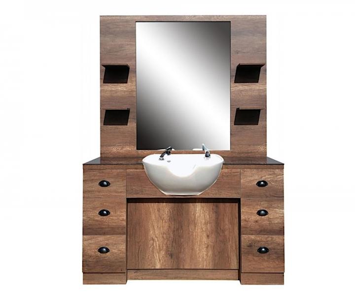 Barber obsluha Hairway Barry s integrovaným keramickým bílým umyvadlem s typickým vykrojením, velkým zrcadlem a mnoha úložnými prostory je nezbytnou potřebou každého barber salonu. Pracovní plocha je vyrobena ze skla, korpus, dvířka a poličky jsou ze dřeva s voděodolnou povrchovou úpravou. Barva: hnědá (imitace dřeva - ořech) Barva umyvadla: bílá ... více »