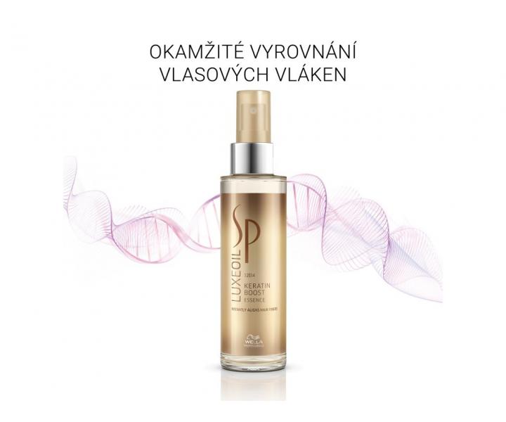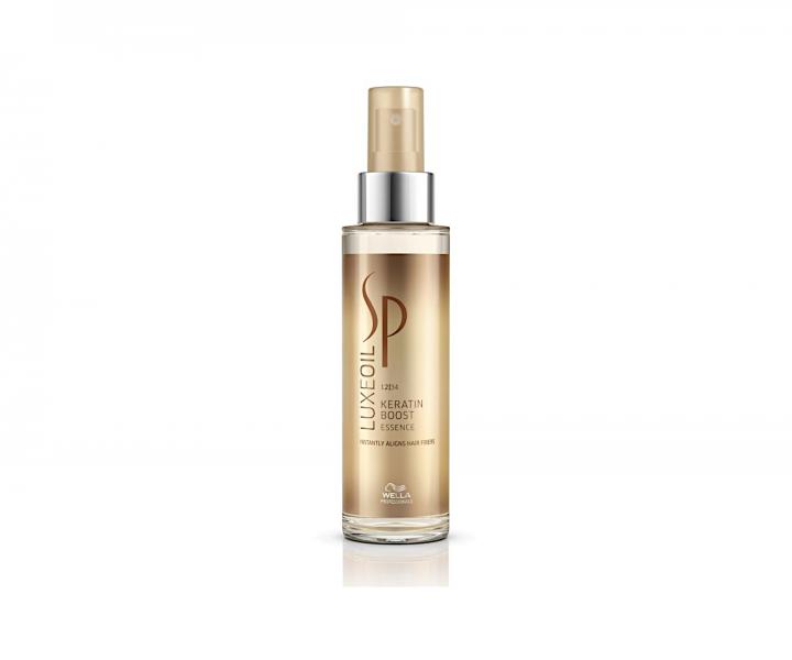 Wella Professionals SP LuxeOil Keratin Boost Essence je bezoplachová vlasová péče s olejem pro posílení vlasů. Během několika málo vteřin budou vlasy nadpozemsky lehké, jemné a plné života. Bezoplachová vlasová péče se rychle vstřebává, proto vlas nezatěžuje a okamžitě přeměňuje jejich strukturu. Složení s keratinem vyplňuje poškozená místa na každém jednotlivém vlasu. Vlasy tak získají na pevnosti a jsou odolnější vůči dalšímu poškození. Bezoplachová vlasová péče je ve svém složení obohacena o tři pečující oleje. Arganový olej, který zajišťuje výživu vlasu. Mandlový olej udržuje dostatečnou hydrataci, kterou vlas pro svůj lesk a hebkost potřebuje. Jojobový olej pečuje o poškozené konečky, které zaceluje a napomáhá proti jejich dalšímu třepení. Péče je vhodná pro všechny typy vlasů.