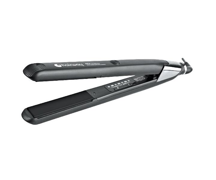 Profesionální žehlička na vlasy Hairway Nano Diamonds Ceramic s ergonomickým tvarováním má keramicko-turmalínové žehlicí plochy. Žehlicí plochy jsou pohyblivé pro lepší kontakt s vlasy a proto je žehlička výborná nejen pro profesionální použití, ale i pro domácí styling. Žehlička disponuje možností nastavení teploty od 100 °C do 230 °C. S žehličkou se velmi dobře manipuluje a je snadno ovladatelná.