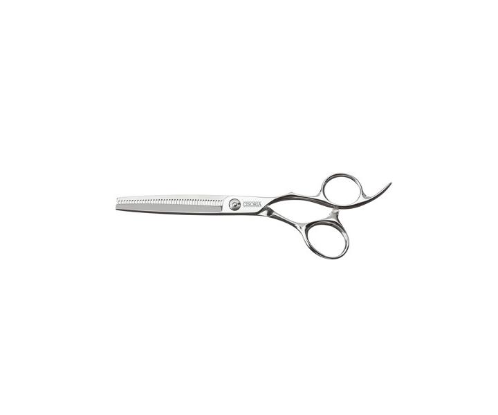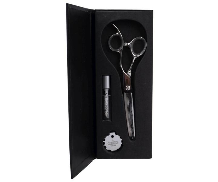 Efilační nůžky Cisoria jsou vyrobeny z kvalitní nerezové oceli 440 C. Pro kvalitní pracovní komfort mají nůžky ergonomický tvar, odnímatelné vnitřní pryžové kroužky a malíkovou opěru. Pro regulaci čepelí slouží středově regulovatelný šroub. Efilační nůžky jsou uložené v kvalitním obalu.