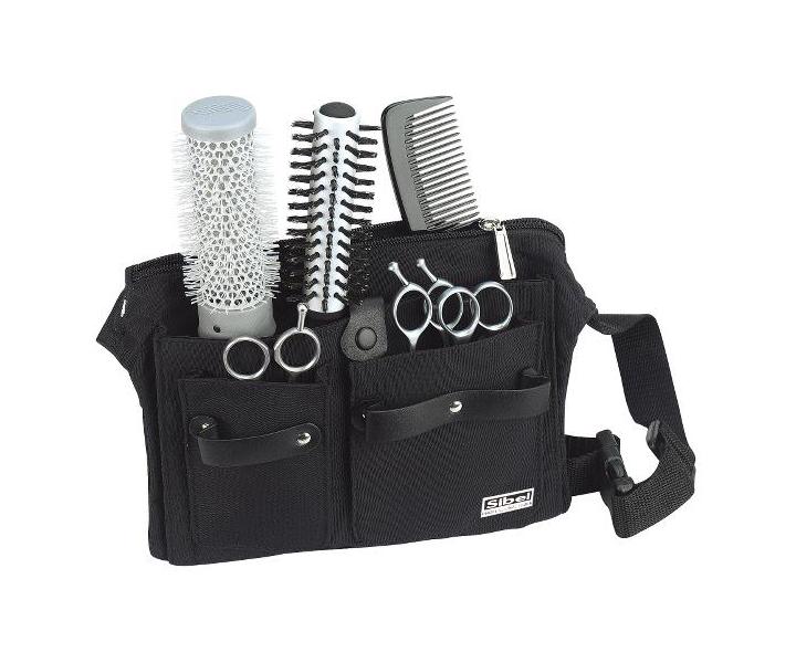 Kadeřnická kapsa na nůžky a ostatní kadeřnické pomůcky Sibel Practical s nastavitelným popruhem kolem pasu. Kapsa má 1 velkou kapsu na zip, 1 velkou otevřenou kapsu, 2 menší otevřené kapsy a 3 přihrádky na nůžky. Kapsa může sloužit i jako úložné pouzdro.