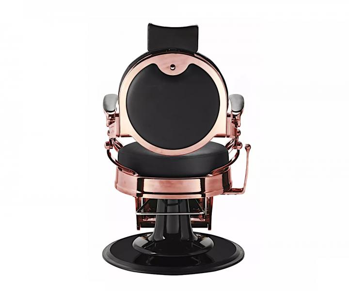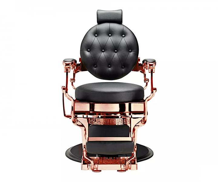 Luxusní kadeřnické barber křeslo Hairway Romeo v černém provedení se zlatou kovovou konstrukcí dodá tu správnou atmosféru každému barbershopu. Křeslo má sklopnou opěrku zad až na 145 °, sklápění je zajištěno pomocí páky na boku křesla. Komplex prvků, jako je nastavitelná a odnímatelná opěrka hlavy, polstrované područky, nožní opěrka a celkové měkké polstrování, zajišťují maximální pohodlí zákazníka. Pevná opěrka nohou je synchronní se sklopnou opěrkou zad, větší pohodlí v poloze vleže pak zajišťuje polstrovaná skládací opěrka nohou. Křeslo má výškově nastavitelný sed pomocí hydraulického pístu s možností jeho otáčení i uzamčení. Vysoce kvalitní umělá koženka křesla usnadňuje údržbu křesla. Stabilitu celému křeslu dodává pevná kulatá základna o průměru 67 cm.