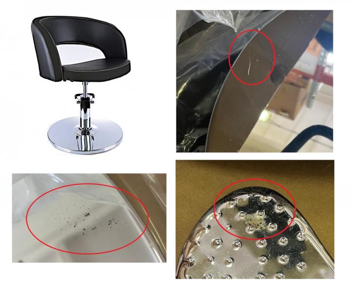 Zboží má drobné povrchové vady - škrábance a rezavé skvrnky na podstavci a podnožníku. Jedná se pouze o kosmetické vady, které nemají vliv na funkci a používání křesla. Obrázky jsou pouze orientační, každé křeslo má jiné vady.