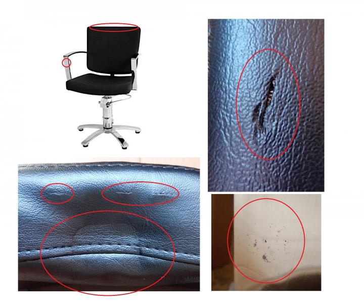 Zboží má povrchové vady - proříznutá koženka a otlaky na opěradle, oděrky na područce. Jedná se pouze o kosmetické vady, které nemají vliv na funkci a používáni taburetu. Fotografie vad jsou ilustrační, každé z křesel má mírně odlišné vady.