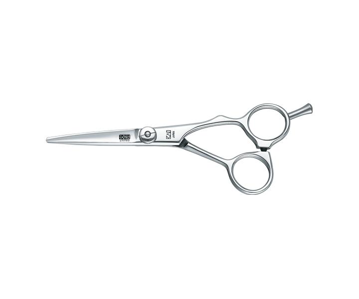 Špičkové japonské nůžky Kasho vyrobené tradiční metodou kovářů japonských samurajských mečů. Tato semi-offset (částečně zahnutá) série je vybavena šroubem nastavujícím napětí a integrovaným kuličkovým ložiskem.