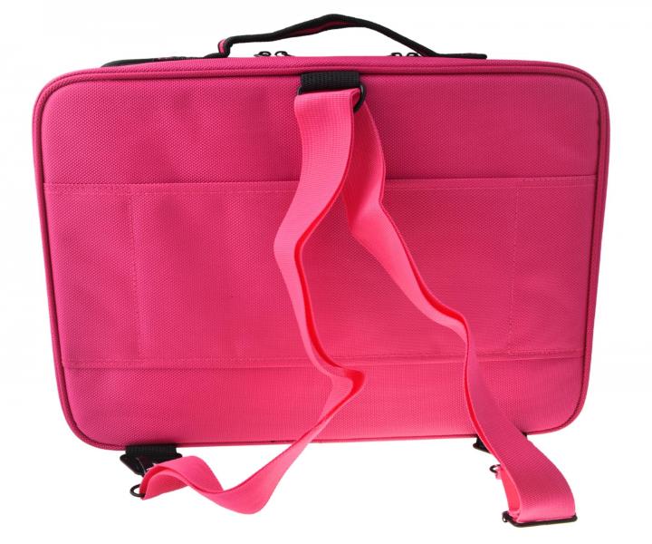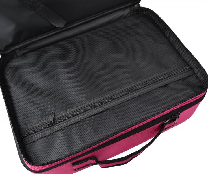 Kadeřnický a kosmetický kufřík Eurostil Professional Pollié je praktický pomocník pro uložení a přepravu stylingových nástrojů i kosmetických a kadeřnických potřeb. Má elegantní aktovkový design a dvě zipem uzavíratelné komory. V přední části se nachází menší přihrádka se dvěma suchými zipy pro upevnění stylingových nástrojů a se síťovanou kapsou na zip pro drobnosti. Hlavní komora je rozdělena na dvě části. Jedna obsahuje zipovou kapsu a elastické přihrádky na hřebeny, barvy na vlasy, sponky, štětce, krémy apod. Druhá část disponuje nastavitelnými přepážkami, které lze přizpůsobit individuálním potřebám. Pro pohodlné nošení slouží pevná rukojeť a nastavitelné ramenní popruhy, které lze upevnit v zadní části, takže kufřík můžete nosit na jednom rameni nebo jako batoh. Na zadní straně se nachází speciální pás pro připevnění na cestovní kufr. Kufřík je vyroben z odolné tkaniny, která je oděruvzdorná a voděodolná. Přední stranu zdobí logo značky. Kufřík není určen pro ukládání horkých nástrojů.