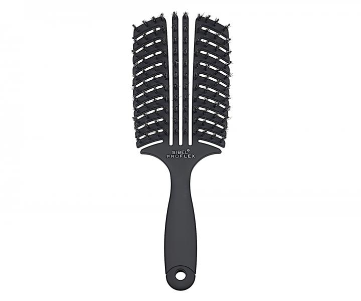 Kartáč na rozčesávání vlasů Sibel Proflex má speciálně tvarovaný, pružný design s velkými otvory mezi prsty kartáče pro dostatečné proudění vzduchu. Dikobrazí štětiny v kombinaci s kančími a nylonovými štětinami skvěle rozčesávají vlasy a uhlazují vlasové vlákno. Tělo kartáče se velmi snadno přizpůsobuje vlasům a vlasové pokožce. Anti-statické štětiny zajišťují obzvláště jemnou péči o vlasy a zabraňují elektrostatickému nabíjení vlasů. Po rozčesání budou vlasy lesklejší a díky nylonovým štětinám pokožka hlavy bude příjemně stimulovaná. Jedinečný design kartáče s protiskluznou a ergonomicky tvarovanou rukojetí perfektně padne do ruky. Kartáč je vhodný pro všechny typy vlasů.