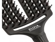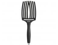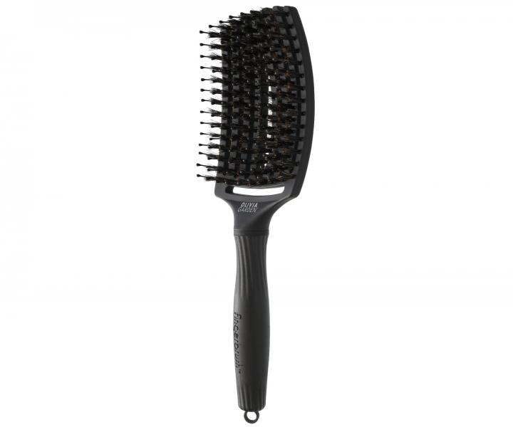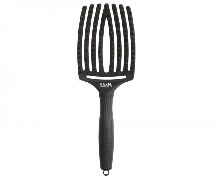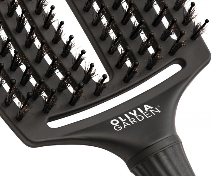 Kartáč Olivia Garden Fingerbrush Combo Large Full Black má speciálně tvarovaný design, který je vhodný k masáži vlasové pokožky. Můžete jej použít jak na mokré, tak suché vlasy. Obsahuje směs čistých kančích štětin, jejich úkolem je vyhladit vlasové vlákno během stylingu a vlasům dodat potřebný lesk, objem a nylonové štětiny, které pokožku jemně stimulují. Extra jemné, anti-statické štětiny zajišťují obzvláště jemnou péči pro vaše vlasy a zabraňují elektrostatickému nabíjení vlasů. Velké vzduchové díry kartáčů poskytují lepší proudění vzduchu. Výsledkem je rychlejší a efektivnější sušení. Ergonomická rukojeť z protiskluzového materiálu a vyjímatelný hrot pro oddělování pramenů zajišťuje maximální pohodlí.