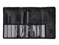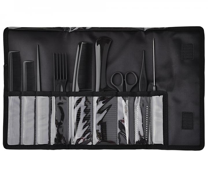 Profesionální sada Eurostil Professional obsahuje 7 hřebenů v černé barvě, nůžky a seřezávací břitvu, které jsou nezbytnou součástí každého kadeřnického salonu nebo barber shopu. V sadě nechybí hřebeny na stříhání, melírování, rozčesávání vlasů apod. Díky kvalitnímu plastovému materiálu jsou hřebeny pevné, odolné proti poškození, lehké a skvěle padnou do ruky. Nůžky o velikosti 6" mají ostří s mikroozubením, umožňují vytvářet rovné střihy a jsou ideální zejména pro začátečníky. Plastová břitva s délkou břitu 7 je ideální pro seřezávání vlasů. Do břitvy se vkládají dvě klasické žiletky, které lze snadno vyměnit. Látkové pouzdro s vnitřními přihrádkami je skvělé pro bezpečné a přehledné uložení těchto nástrojů. Pouzdro má zapínání na suchý zip a plastovou klipsu, uvnitř pak jednotlivé přihrádky pro každý z nástrojů.