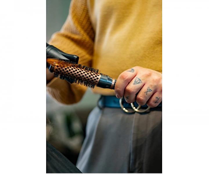 Kulatý foukací kartáč na vlasy Olivia Garden Expert Blowout Heat Nylgard s průměrem 15 mm je navržen pro precizní styling a tvarování vlasů při foukání. Jeho keramicko-měděná technologie zajišťuje rovnoměrné rozložení tepla, což zkracuje dobu foukání a umožňuje rychlé a efektivní sušení a styling. Kartáč má lehkou, perfektně vyváženou konstrukci a ergonomickou rukojeť pro pohodlnou manipulaci. Jeho unikátní štětiny Nylgard jsou pružné a velmi odolné vůči vysokým teplotám až do 290 °C. Díky malému průměru je kartáč ideální pro vytváření jemných vln, objemu a detailů u krátkých vlasů. Vyjímatelný hrot umístěný v rukojeti kartáče je praktickým nástrojem pro oddělování jednotlivých pramenů a precizní styling.