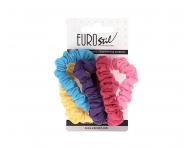 Látkové gumičky do vlasů Eurostil Professional ve žluté, modré, fialové, růžové a světle růžové barvě jsou praktickým a elegantním doplňkem účesu. Díky tenké gumičce uvnitř látky jsou gumičky velmi pružné, nezamotávají se do vlasů a díky pevnosti perfektně drží. Gumičky jsou vhodné pro všechny typy vlasů a mohou být skvělým doplňkem nejen vašeho účesu, ale také outfitu. Balení obsahuje 5 gumiček.