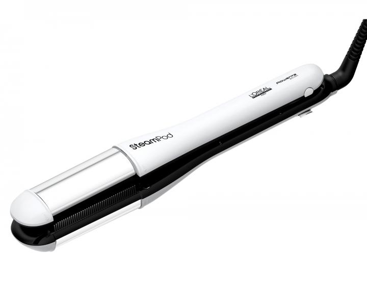 Multifunkční parní žehlička na vlasy Loréal Professionnel SteamPod 4 umožňuje až 3x rychlejší žehlení, 2x uhlazenější výsledek a až od 95 % menší poškození vlasů (ve srovnání se SteamPod 4 bez páry a hřebínku). Díky novému ergonomickému designu se žehlička dostane až o 30 % blíže ke kořínkům vlasů. Extra plovoucí horní žehlicí destička zajišťuje optimální přilnavost ke všem typům vlasů. Žehlicí destičky jsou keramické a jsou potažené vrstvou hliníku, který zvyšuje jejich odolnost a to i v případě intenzivního používání žehličky. Žehlička má teplotní nastavení od 180 °C do 210 °C a je tak vhodná pro všechny typy vlasů. Chytrá regulace teploty kontroluje teplotu destiček až 250x za vteřinu, čímž je zajištěno rovnoměrné zahřátí destiček. Parní technologie rozptyluje až 0,8 g páry za minutu pro viditelně hladší výsledek žehlení a jedno naplnění nádržky na vodu vystačí na vyžehlení až 192 metrů vlasů. Žehlička je také vhodná pro vytváření vlnitého stylingu vlasů díky nahřívacím plochám na vnějších stranách těla žehličky, které se zahřívají na 100 °C a lze s nimi vytvořit výrazné a pružné vlny. Tyto plochy lze pro bezpečnost zakrýt tepluvzdornými kryty, které jsou součástí balení. Součástí balení jsou také 3 hřebínky o různých šířkách zubů, které optimalizují rozptyl páry dle typu vlasů. Manipulaci se žehličkou usnadňuje 2,5 metrů dlouhý a o 360 ° otočný kabel. Bezpečnost je pak zajištěna automatickým vypnutím žehličky po 30 minutách nečinnosti. Při cestování se může hodit tepluvzdorné cestovní pouzdro.