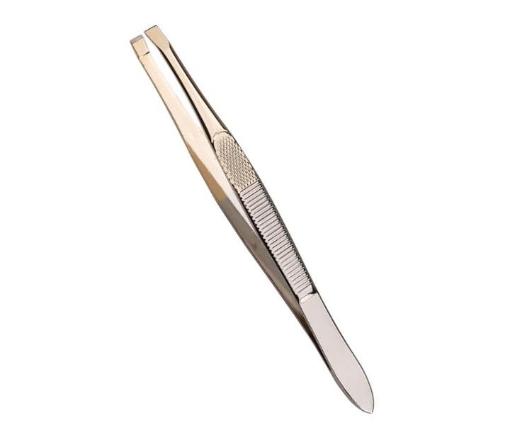 Úzká rovná pinzeta se zlatým zakončením je nepostradatelným pomocníkem v každém kosmetickém salonu pro úpravu a vytrhávání chloupků.