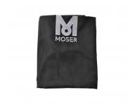 Profesionální kadeřnická pláštěnka na stříhání vlasů Moser v černé barvě s jemnými proužky a upevněním na háčky. Na pláštěnce je vyšité logo Moser.