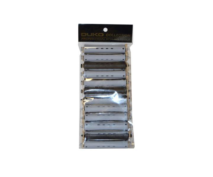 Plastové průtokové natáčky Duko pro trvalou ondulaci. Natáčky mají kulatou gumičku pro snažší uchycení natočeného pramenu vlasů. Gumičku lze snadno vyměnit. Průměr: 16 mm Délka: 80 mm Barva: černo-šedá Materiál: plast Počet ks v balení: 12