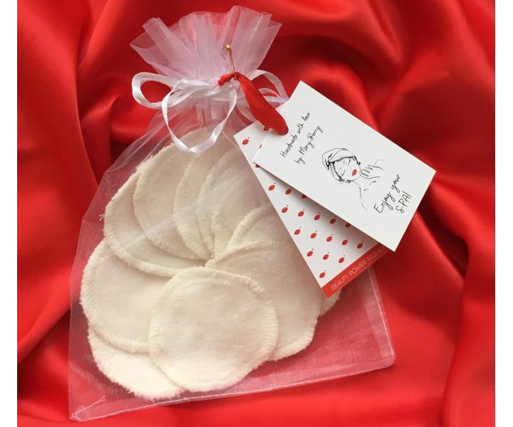 Pratelné kosmetické tamponky MaryBerry Soft Touch pro pohodlné a zároveň maximálně ekologické použití. Jsou vyrobeny ze 100% bavlny typu velur (vnitřní strana froté, vnější má hustý a krátký vlas, takže povrch připomíná samet), takže použití pro vás bude příjemné. Jemnější strana se postará o důkladné odlíčení zatímco hrubší o ještě pečlivější čistění pokožky a odstranění pleťových masek. Materiál je savý a stálobarevný. Lze je jednoduše přeprat v ruce nebo dát do pračky a bez použití aviváže vyprat při teplotě 40 °C až 60 °C. Balené v dárkovém sáčku.