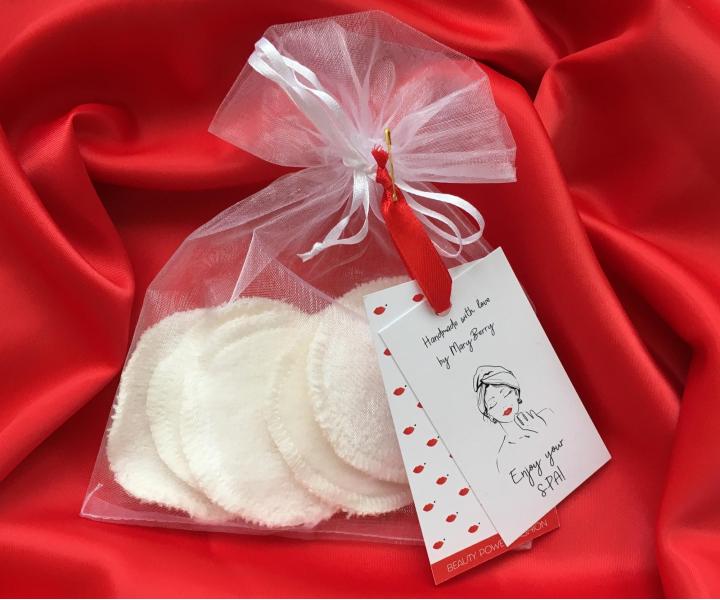 Pratelné kosmetické tamponky MaryBerry Soft Touch pro pohodlné a zároveň maximálně ekologické použití. Jsou vyrobeny ze 100% bavlny typu velur (vnitřní strana froté, vnější má hustý a krátký vlas, takže povrch připomíná samet), takže použití pro vás bude příjemné. Jemnější strana se postará o důkladné odlíčení zatímco hrubší o ještě pečlivější čistění pokožky a odstranění pleťových masek. Materiál je savý a stálobarevný. Lze je jednoduše přeprat v ruce nebo dát do pračky a bez použití aviváže vyprat při teplotě 40 °C až 60 °C. Balené v dárkovém sáčku.