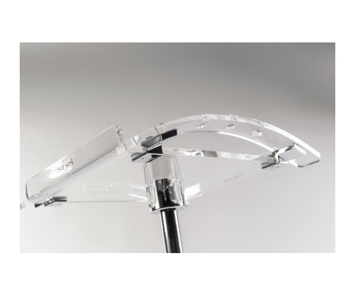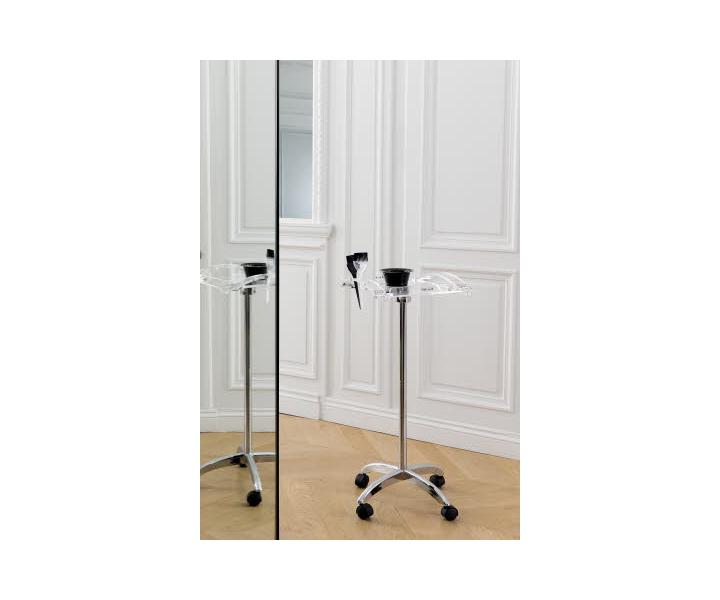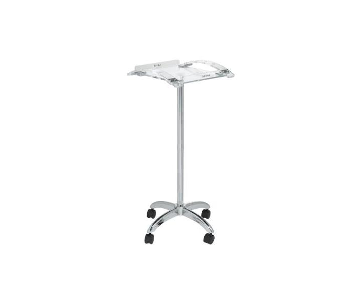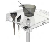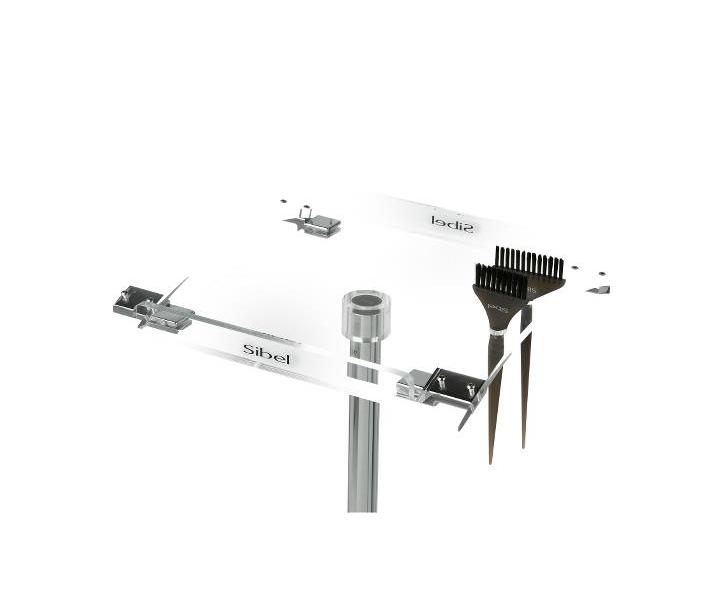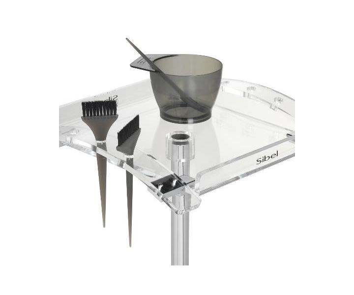 Sibel luxusní profesionální kadeřnický odkládací stolek s pracovní plochou a šesti otvory pro odkládání štětců je velmi praktický a dobře omyvatelný. Odkládací plocha je vyrobena z kvalitního a velmi pevného akrylátového plastu, který je praktický a lépe se udržuje. Je schopný odolávat vysoké teplotě a chemickým rozpouštědlům nebo peroxidům.