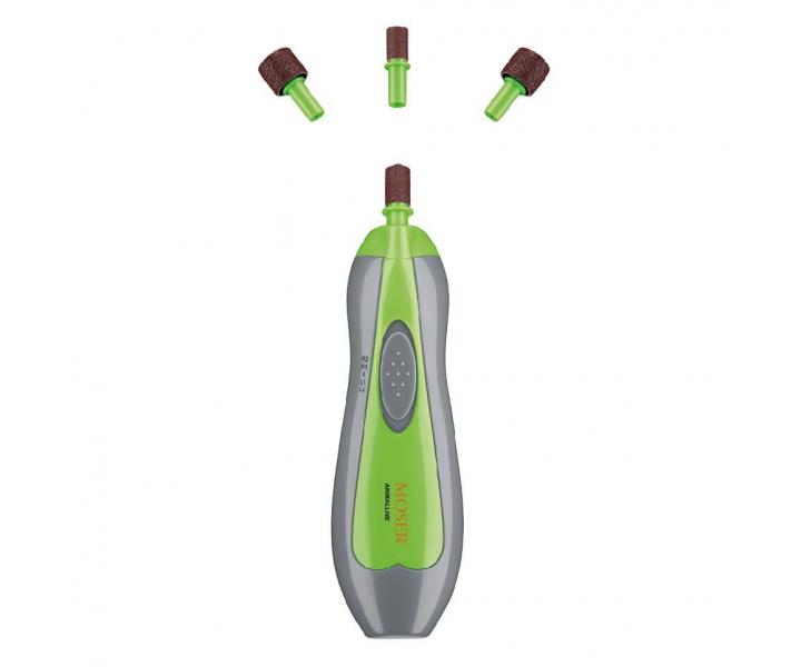 Speciální bezdrátová bruska na drápky pejsků a koček Moser 2302-0050. Bruska je vhodná pro jednoduché zkracování a začišťování drápků. Dva rychlostní stupně, chod doleva a doprava. Praktické mini osvětlení pro bezpečnější obsluhu během obrušování. 4 výměnné hlavice