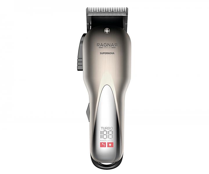 Profesionální strojek Ragnar Supernova Silver s výkonem až 5700 otáček za minutu je díky turbo funkci skvělým pomocníkem pro stříhání vlasů i vousů. Strojek je vybaven dvěma střihacími hlavicemi z japonské oceli o šířce 45 mm, standardní hlavicí pro klasické střihy a flat hlavicí pro velmi nízké střihy. Díky aretovací páčce na boku strojku je možné plynule měnit výšku střihu strojku. Výšku střihu lze také měnit pomocí plastových nástavců s kovovou sponou o velikosti 1,5 mm, 3 mm, 4,5 mm, 6 mm, 10 mm a 13 mm, které jsou součástí balení. LCD displej na těle strojku informuje o zbývající kapacitě baterie, aktivaci turbo režimu, nutnosti promazání strojku a také stavu baterie při nabíjení. Doba provozu strojku je až 240 minut, doba nabíjení pak 180 minut. Součástí balení je čisticí kartáček, olej, krytka hlavice, nabíjecí adaptér a látkový pytlík.