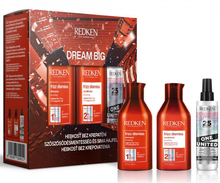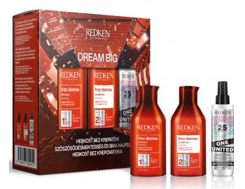 Řada pro krepaté a nepoddajné vlasy Redken Frizz Dismiss máme v nabídce ve více variantách - typ dárková sada - šampon + péče + pečující sprej s 25 benefity, krém - 250 ml, maska - 250 ml, olejové sérum - 125 ml, péče - 300 ml a šampon - 300 ml. Na této straně naleznete přehled všech verzí - parametrem členění je typ. Řada pro krepaté a nepoddajné vlasy Redken Frizz Dismiss v prodeji od 459,- Kč do 1.112,- Kč se slevou až 15 %.