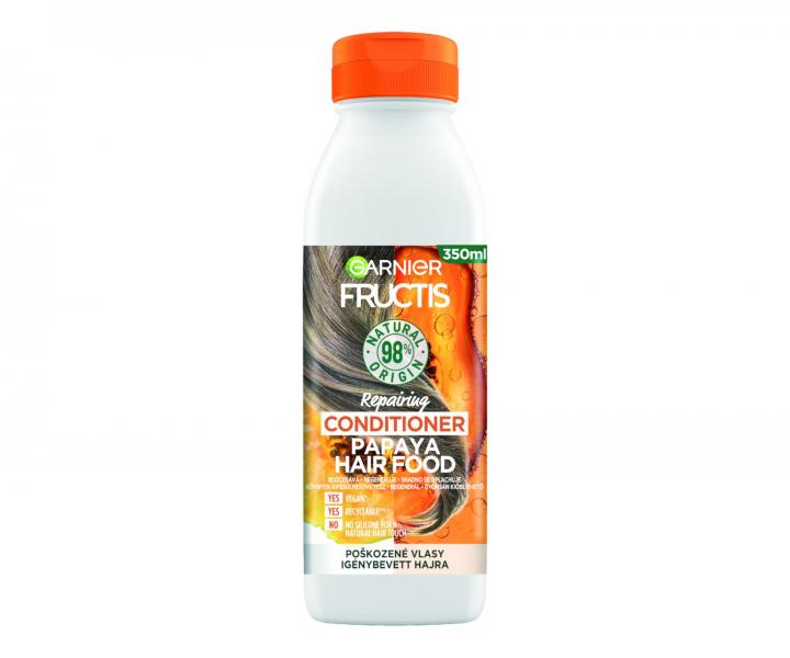Regenerační kondicionér Garnier Fructis Papaya Hair Food je extra výživný přípravek s výtažky z papáji pro akutní obnovu poškozených vlasů. Vlasy se jednoduše rozčesávají, jsou intenzivně zregenerované a vypadají zdravě. Složení obsahuje 98 % složek přírodního původu, zbylá 2 % zahrnují jemnou parfemaci a správnou konzistenci. Bez silikonů, parabenů a umělých barviv.