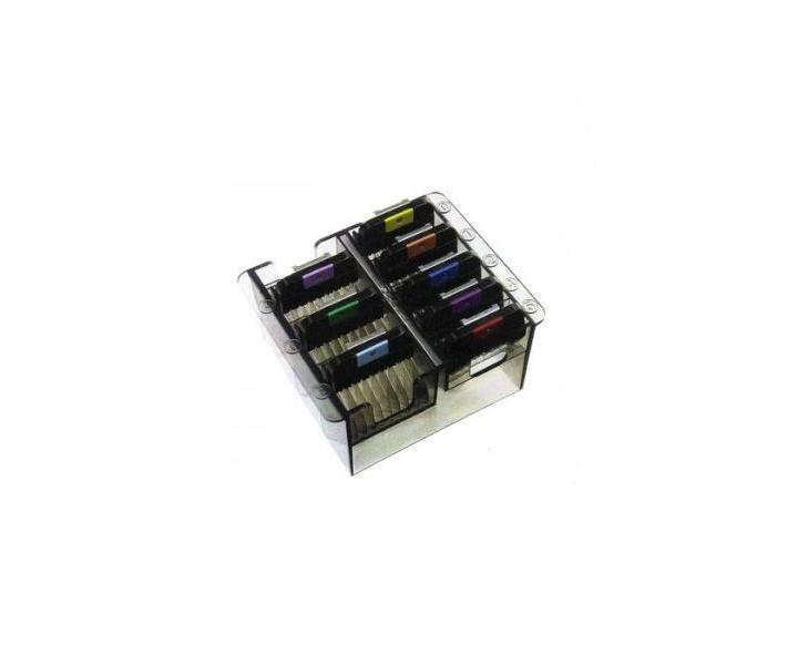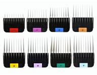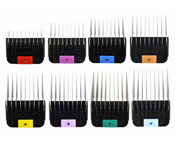 Sada náhradních kovových hřebenů Wahl 1247-7440 výšky střihu 3 mm, 6 mm, 10 mm, 12 mm, 16 mm, 19 mm, 22 mm a 25 mm je vhodná pro profesionální stříhací strojky se systémem výměnných stříhacích hlavic: MOSER 1245, 1250, WAHL KM2, KM5, KM10. Hřebeny jsou uloženy v plastovém průhledném boxu.
