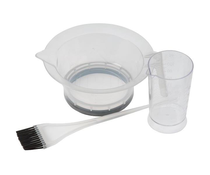Sada pro barvení vlasů Sibel obsahuje základní pomůcky pro barvení a melírování vlasů. Sada obsahuje misku, odměrku a štětec. Miska má vyznačené rysky a má protiskluzový kroužek na spodní straně pro bezpečnou manipulaci a lepší přilnavost k povrchu. Plastová odměrka má měrné rysky na melírovací prášek, odbarvovací/zesvětlující pudr. Odměrka je velmi praktický pomocník pro kadeřníky. Rysky jsou vyznačené po 10 ml (10 - 100 ml).