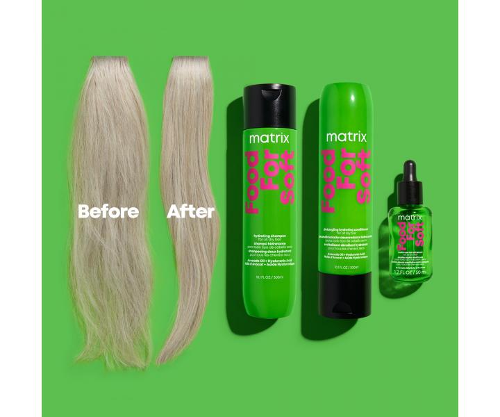 Hydratační kondicionér Matrix Food For Soft Detangling Hydrating Conditioner je skvělým řešením pro obnovení síly a hebkosti vlasů. Unikátní receptura obohacená o avokádový olej a kyselinu hyaluronovou dokáže dokonale doplnit vlhkost suchým a křehkým vlasů. Po použití jsou vlasy až 7x více hydratované, hebké na dotek a lesklé na první pohled. Zároveň je jeho účinek je tak silný, že udržuje hydrataci a hebkost až po dobu 72 hodin a vlasové vlákno je až 5x více vyživené. Mezi jeho další přednosti patří například to, že nabízí až 5x snáze rozčesatelné vlasy. Kondicionér je vhodný pro všechny typy suchých vlasů.