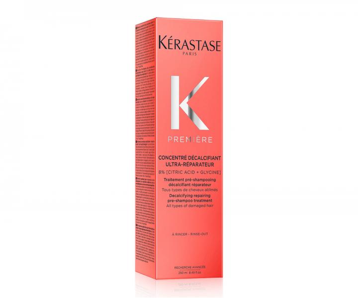 Předšamponová péče Kérastase Premiére Concentré Décalcifiant Ultra-Réparateur účinně odstraňuje z vlasů přebytečný vápník, a zároveň obnovuje všechny typy poškozených vlasů, od jemných až po silné. Poškozené vlasy kvůli své poréznosti vstřebávají z vody oproti zdravým vlasům 3x více vápníku, který se dostává mezi keratinové řetězce a ničí jejich vazby. Tím dochází k dalšímu poškozování vlasů, jejich nepoddajnosti, tvrdosti a lámavosti. Přebytečný vápník se hromadí i na povrchu vlasů, ty jsou potom matné a hrubé na dotek. Předšamponová péče díky obsahu organické 8% kyseliny citronové pomáhá s odstraněním vápníku z povrchu i jádra vlasového vlákna, čímž eliminuje matnost a nepoddajnost vlasů. Aminokyselina glycin po odstranění vápníku z vlasů proniká do vnitřní struktury vlasového vlákna, kde se stará o hloubkovou obnovu, napravuje poškozené keratinové vazby a snižuje lámavost vlasů. Výsledkem pravidelného používání je obnova původní síly vlasů, zpevnění jejich vnitřní struktury, menší lámavost a větší lesk, vlasy jsou na pohled zdravější a jako znovuzrozené. Předšamponová péče s čirou gelovou texturou a složením bez obsahu sulfátů, silikonů, parabenů a alkoholu Vás zahalí do opojné vůně citrusů a mandarinky, která se snoubí s harmonickou vůní květů pomeranče a jasmínu a obklopující vůní jemných a bohatých dřevin. Obal je vyroben z 95% recyklovaného plastu.