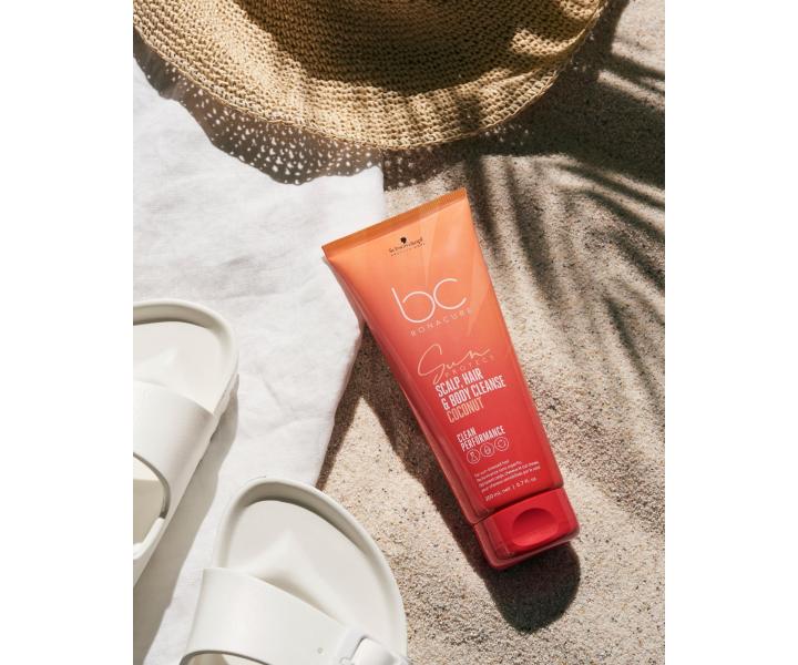 Osvěžující šampon Schwarzkopf Professional BC Bonacure Sun Protect Scalp, Hair & Body Cleanse Coconut Clean Performance obsahující unikátní technologii na bázi kokosového oleje chrání a ošetřuje všechny typy vlasů, pokožku hlavy a tělo před a po slunečním záření. Bezsulfátové složení šetrně odstraňuje zbytky z vlasů a pokožky a zároveň vlasy posiluje. Současně je také vyživuje a tím snižuje jejich lámání. Redukuje také blednutí barvy a chrání vlasy před volnými radikály. Vlasy jsou tak krásné a dokonale lesklé.