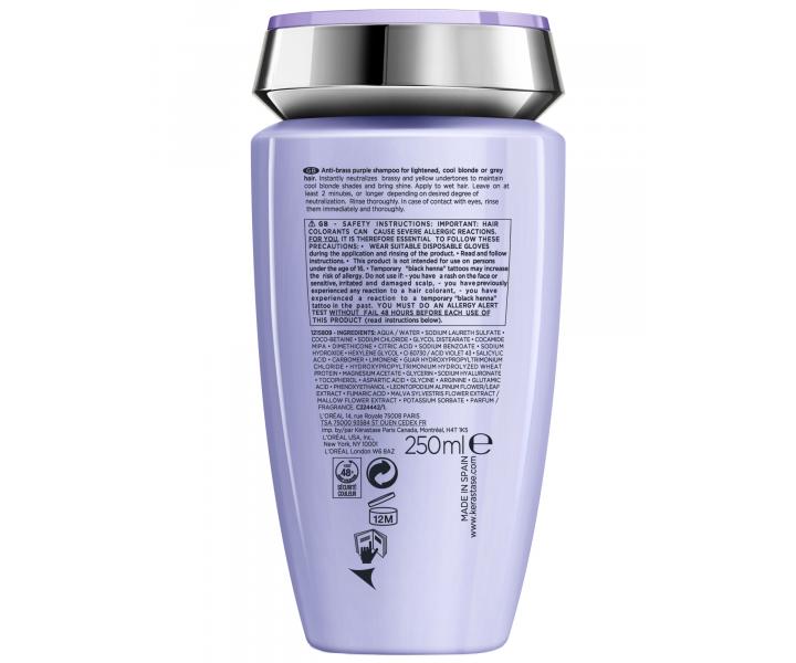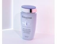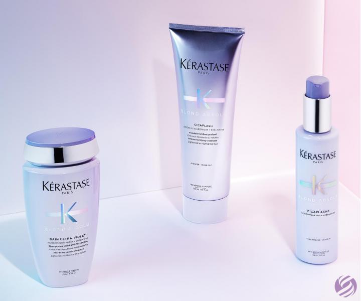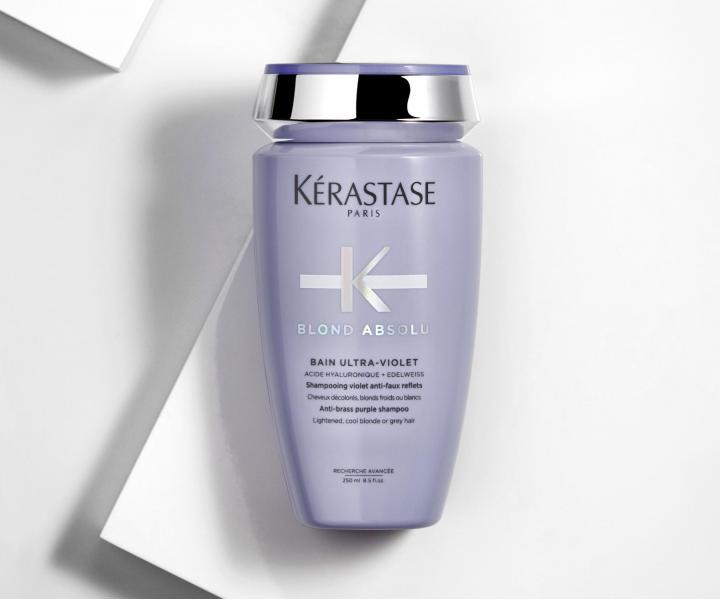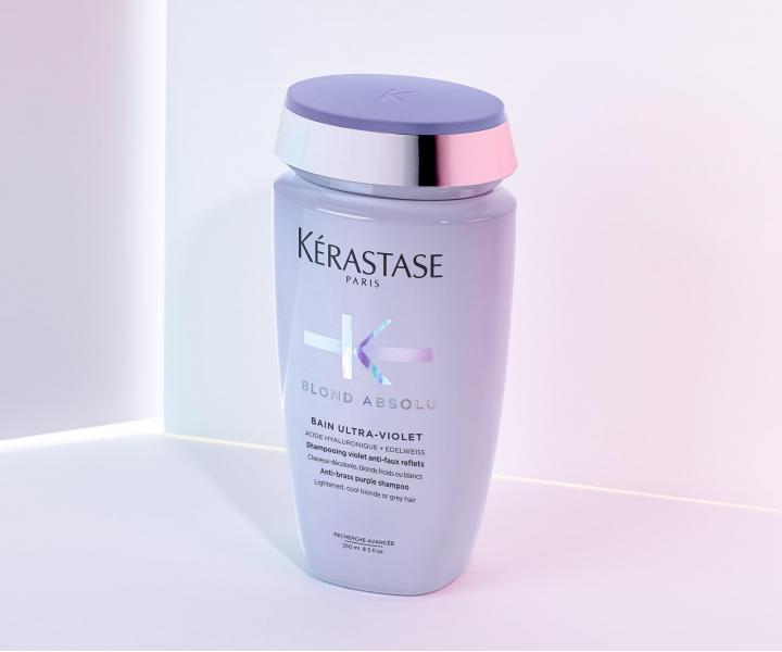 Šamponová lázeň Kérastase Blond Absolu Bain Ultra-Violet je speciálně vyvinutá pro potřeby zesvětlených, blond nebo šedivých vlasů. Díky bohatému obsahu fialového a modrého pigmentu neutralizuje žluté tóny, zachovává studené odlesky a dodává mimořádný lesk. Složení obohacené o kyselinu hyaluronovou a květ plesnivce alpského zjemňuje vlasové vlákno, léčí trhliny uvnitř vlasového vlákna a zaceluje jeho povrch. Šampon je vhodný ke každodennímu použití.