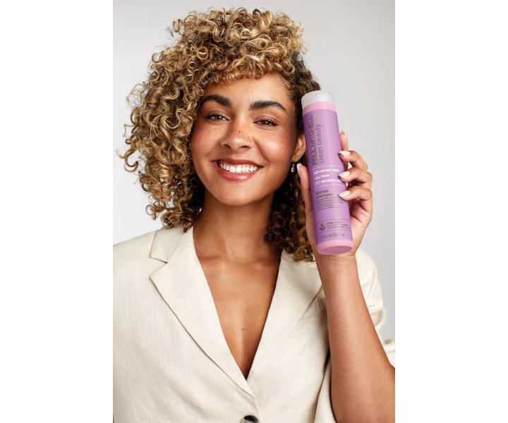 Fialový tónovací šampon Paul Mitchell Clean Beauty Blond Shampoo šetrně čistí vlasy a současně udržuje blond, zesvětlené, platinové, bílé, stříbrné a šedivé vlasy stále krásné bez nežádoucích žlutých tónů. Šampon totiž obsahuje fialové pigmenty, které okamžitě neutralizují nežádoucí zažloutlé a teplé tóny blond vlasů. Unikátní receptura dále obsahuje 82 % přírodních ingrediencí, včetně výtažku z granátového jablka a brutnákového oleje. Kombinace těchto složek efektivně působí proti vyblednutí barvy. Složení šamponu také chrání vlasové vlákno, změkčuje ho a dodává mu lesk.