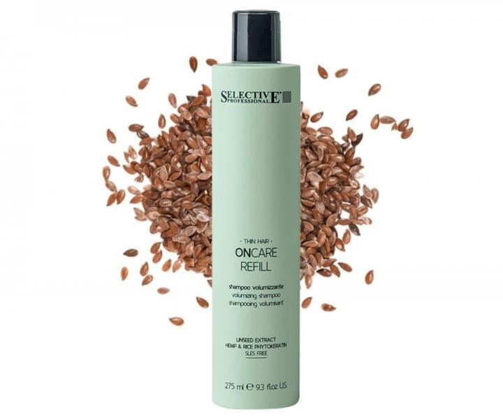 Šampon Selective Professional OnCare Refill Shampoo je ideální pro objem jemných a řídnoucích vlasů, které jsou křehké a potřebují viditelný objem a sílu. Obsahuje lněná semínka, která dodávají vlasům pružnost, lesk a potřebnou pevnost. Omega 3 mastné kyseliny hydratují a posilují vlasové stvoly, čímž zabraňují jejich lámání. Fytokeratin z konopí a rýže je přírodní výtažek rostlinných keratinů, který zpevňuje a obnovuje vlasovou strukturu. Je bohatý na živiny, pomáhá regenerovat oslabené vlasy a udržuje v nich potřebnou vlhkost. Neobsahuje sulfátové povrchově aktivní látky, jako jsou SLS a SLES.
