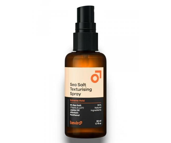 Texturizační sprej Beviro s 9% obsahem mořské soli dodá vlasům texturu a objem. Působí fixačně. Obsahuje další přírodní látky, které zabraňují vysušení vlasů i pokožky. Použití je jednoduché a přípravek lze kombinovat s dalšími stylingovými produkty. Vhodný pro profesionální použití a složitější účesy. Přípravek není vhodné aplikovat na pokožku hlavy, pouze na vlasy. Obsahuje 90 % přírodních složek.