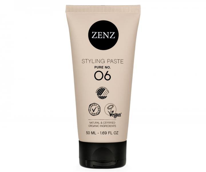 Stylingová pasta Zenz Styling Paste Pure No. 06 obsahuje ve svém složení až 88 % složek přírodního původu a 58 % bio složek s certifikací. Jedná se o velmi efektivní pastu, se kterou můžete vytvářet nejrůznější účesy u všech typů vlasů. Nejvhodnější je pro styling krátkých vlasů nebo kudrnatých vlasů. Pasta má měkkou konzistenci, po nanesení do suchých vlasů dodává texturu a fixaci, po nanesení do mokrých vlasů před jejich vysušením dodává texturu a objem, u kudrnatých vlasů podporuje jejich vlnitost. Aktivní látky stylingové pasty, mezi které patří Aloe Vera a glycerin, poskytují vlasům výživu a hydrataci. Veganské složení pasty na vodní bázi je velmi šetrné k pokožce, hypoalergenní, bez parfemace a bez silikonů. Z vlasů se velmi snadno vymývá a nezanechává zbytky.