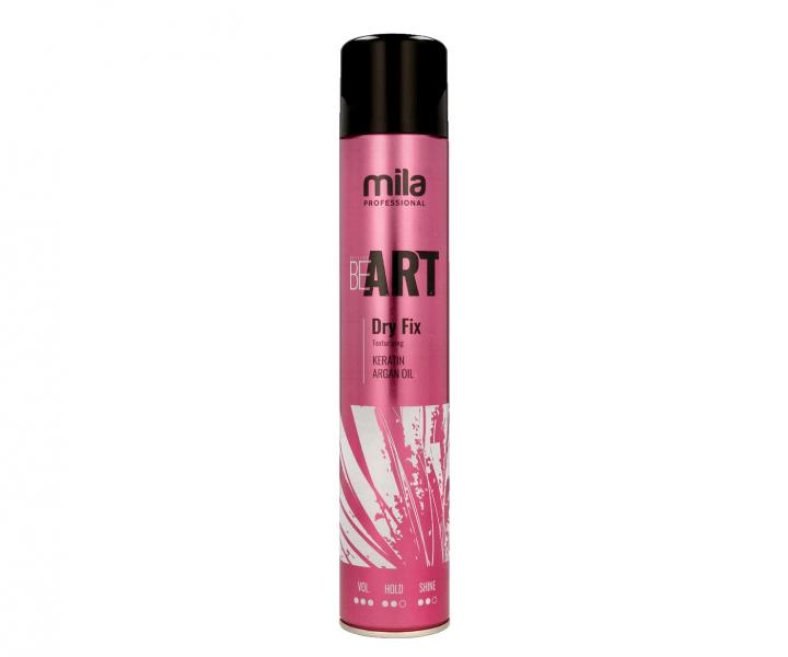 Suchý lak na vlasy Mila Be Art Dry Fix rozprašující jemné částice. Díky obsahu arganového oleje jsou vlasy extrémně lesklé, jemné a hedvábné. Keratin posiluje vlasy a dodává jim strukturu. Lak dodává vlasům objem a přirozený vzhled, nelepí je ani je nezatěžuje. Dává možnost dlouhodobé modelace, a zároveň se snadno vyčesává.