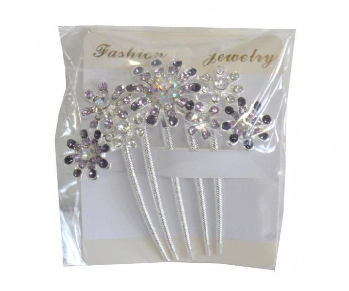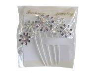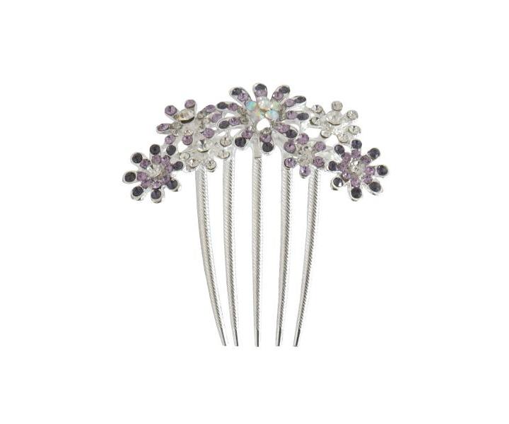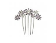 Krásný hřebínek do vlasů je ozdoben 7mi kytičkami třech velikostí, které jsou osázeny štrasovými kamínky v kombinaci tří barev. Hřebínek je perfektní ozdobou do vlasů, která je vhodná nejenom pro nevěstu na svatební den, ale rovněž pro různé plesy a další slavnostní události. Štrasový hřebínek je pevný a dostatečně dlouhý. Kamínky jsou vybroušené, krásně se blýskají a třpytí.