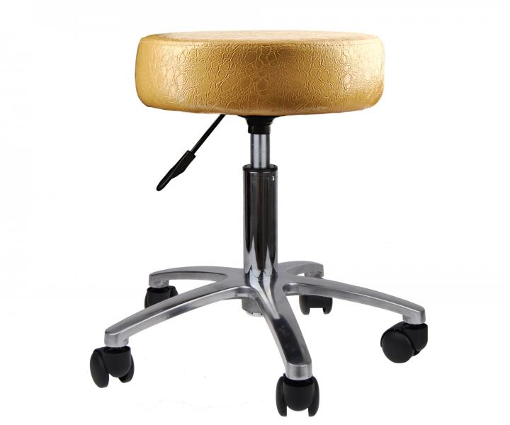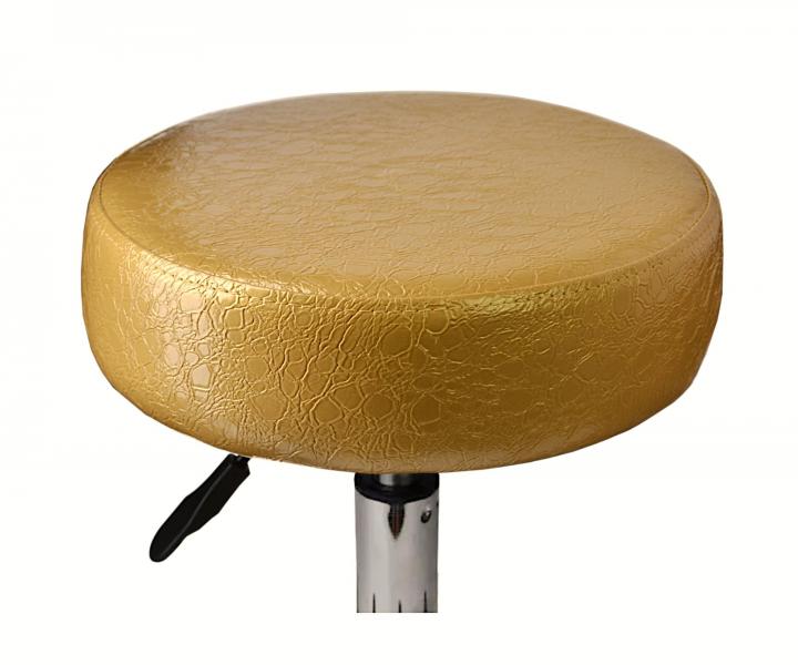 Kosmetický a kadeřnický taburet Detail BOB ve zlaté barvě Vás upoutá svým jedinečným designem a dodá jedinečnou atmosféru jakémukoliv salonu, ať už kadeřnickému nebo kosmetickému. Sedák taburetu, potažený velmi kvalitní umělou kůží s imitací krokodýlí kůže, sedí na výškově nastavitelném pístu s možností nastavení výšky od 47 cm do 63 cm. Stabilitu pak taburetu dodává pětipaprskový chromový matný podstavec s plastovými kolečky, díky kterým se můžete s taburetem snadno pohybovat. Taburet je možné použít i v jiných oborech, např. pro vizážistky, fotografy atd.