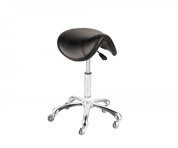 Kosmetický a kadeřnický taburet Fox RODEO II na plastových kolečkách s výškově nastavitelným sedem, chromovou stabilní konstrukcí a polstrováním z umělé kůže pro komfortní pohodlí při práci. Taburet sedí na pětipaprskovém chromovém podstavci.