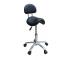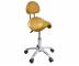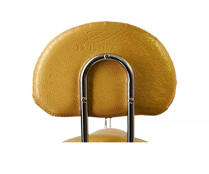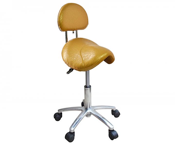 Kosmetický a kadeřnický taburet s opěrkou zad Detail T2 ve zlaté barvě Vás upoutá svým jedinečným designem a dodá jedinečnou atmosféru jakémukoliv salonu, ať už kadeřnickému nebo kosmetickému. Sedák taburetu, potažený velmi kvalitní umělou kůží s imitací krokodýlí kůže, sedí na výškově nastavitelném pístu s možností nastavení výšky od 48 cm do 62 cm. Sedlový tvar sedáku zajišťuje pohodlné sezení. Stabilitu pak taburetu dodává pětipaprskový chromový matný podstavec s plastovými kolečky, díky kterým se můžete s taburetem snadno pohybovat. Taburet je možné použít i v jiných oborech, např. pro vizážistky, fotografy atd. Na zadní straně opěrky je do kůže vytlačené logo značky.