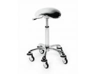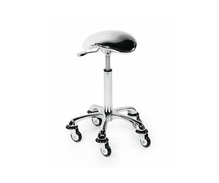 Kosmetický a kadeřnický taburet na kolečkách Sibel Eccentric v luxusním stříbrném provedení. Má ergonomicky tvarovaný sedák ve tvaru sedla pro maximální pohodlí a výškově nastavitelný sed. Povrch metalíza a stříbrná barva bude tvořit dokonalý doplněk vašeho salónu.