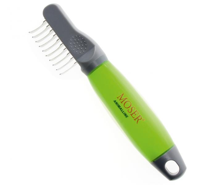 Vyčesávací hráblo na zvířecí srst Moser Animal Line šetrně prořezává a odstraňuje plstnatou srst. Vhodný pro hustou a dlouhou srst velkých, středních i malých plemen. Příjemné gelové držadlo se přesně vytvaruje podle vaší dlaně. Díky tomu je kartáč dobře uchopitelný a neklouže z ruky. Protiskluzová úprava na palec umožňuje lepší manipulaci s hřebenem. Součástí rukojeti je očko pro zavěšení a odložení kartáče.