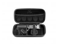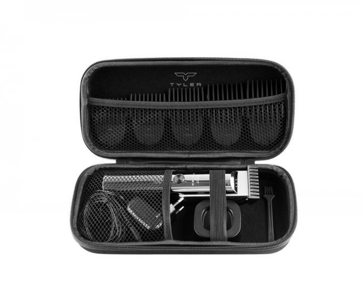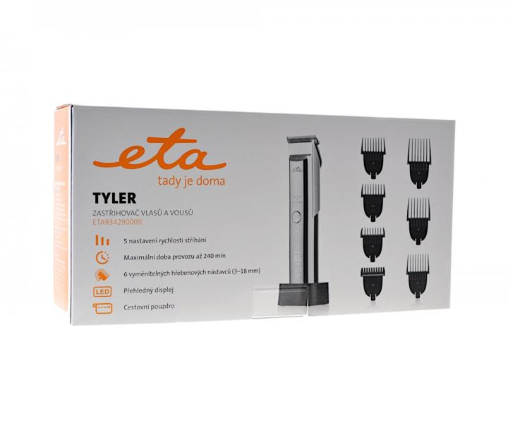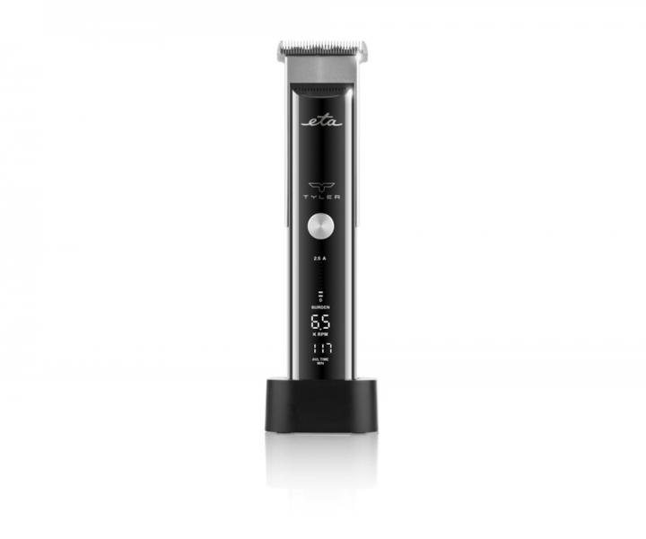 Elegantní zastřihovač na vlasy a vousy ETA Tyler má odnímatelnou hlavici s titanovo-keramickým ostřím a nastavitelnou výškou střihu v rozsahu od 0,8 mm do 2,0 mm pomocí posuvného tlačítka na zadní straně zastřihovače. Výšku střihu lze také měnit za pomoci šesti hřebenových nástavců o velikosti 3 mm, 6 mm, 9 mm, 12 mm, 15 mm a 18 mm. Praktický je také nástavec na prostříhávání hustých vlasů. Zvolit si můžete jednu z pěti rychlostí stříhání. Aktuálně zvolenou rychlost přehledně ukazuje displej zastřihovače, stejně jako aktuální počet kmitů, stupeň zatížení břitů, zbývající kapacitu akumulátoru, nutnost promazání olejem a stav nabíjení. Zastřihovač lze používat jak na síťový, tak akumulátorový provoz. Doba nabíjení zastřihovače je 3 hodiny, doba provozu 240 minut. Pro pohodlné uskladnění zastřihovače je součástí balení pevné pouzdro.