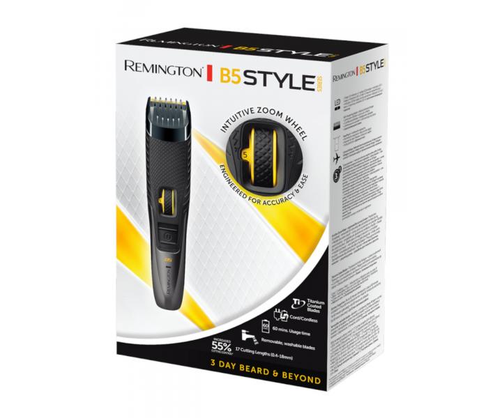 Zastřihovač vousů Remington B5 MB5000 poskytuje skvělou kontrolu nad úpravou vousů. Výška střihu je 0,4-18 mm. Výšku střihu 0,4-5 mm nastavíte v krocích po 0,5 mm a výšku střihu v rozmezí 6-18 mm vžy v kroku po 2 mm. Výšku střihu navíc nastavíte jednoduše pomocí otočného kolečka a integrovaného nástavce přímo na strojku. Strojek má odnímatelné, omyvatelné a samoostřící čepele, které jsou pokryty titanem. Doba nabíjení strojku je 60 minut a doba provozu při plném nabití je 60 minut. Dvoufázový LED indikátor oceníte při kontrole nabití strojku.