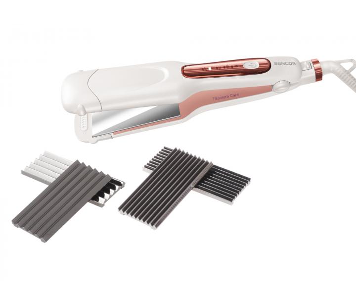 Žehlička a krepovačka na vlasy 2v1 Sencor v perleťově bílé barvě v kombinaci s růžovou se stane stylovým pomocníkem pro úpravu vašich vlasů. Balení obsahuje 3 vyměnitelné plochy pro žehlení a krepování a vy si tak užijete účes dle nálady. Nastavitelná teplota chrání vaše vlasy a indikátor teploty ulehčuje nastavení. Povrch žehlících a krepovacích ploch je potažen titanem. Navíc je ultra lehká a nezatěžuje tak ruce. Žehlička a krepovačka 2v1 disponuje funkcí zámku teploty během používání a funkcí automatického vypnutí.